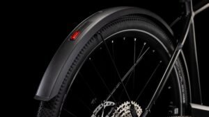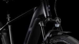 Wenn CUBE etwas kann, dann elegante Rahmen mit 1a-Handling bauen – doch bei der Entwicklung des Nuride Hybrid haben sie sich in Sachen funktioneller Ästhetik selbst übertroffen. Neben einer Federgabel mit 100 mm Federweg für ein Plus an Fahrkomfort und Kontrolle haben sie das Chassis mit großzügiger Reifenfreiheit (sogar inklusive der mitgelieferten Schutzbleche) ausgestattet. Im Inneren verlaufende Züge unterstreichen die cleane Optik des Rahmens und verursachen kaum Wartungsaufwand. Ebenso harmonisch ins Design integriert sind der Bosch CX Antrieb und der starke PowerTube Akku. Außerdem gibt’s einen Kettenschutz sowie ein UDH für einfachere Ersatzteilverfügbarkeit. Was noch? Serienmäßig verbaute Schutzbleche, Lichter und ein Seitenständer. Da kann das nächste Touren-Abenteuer kommen!