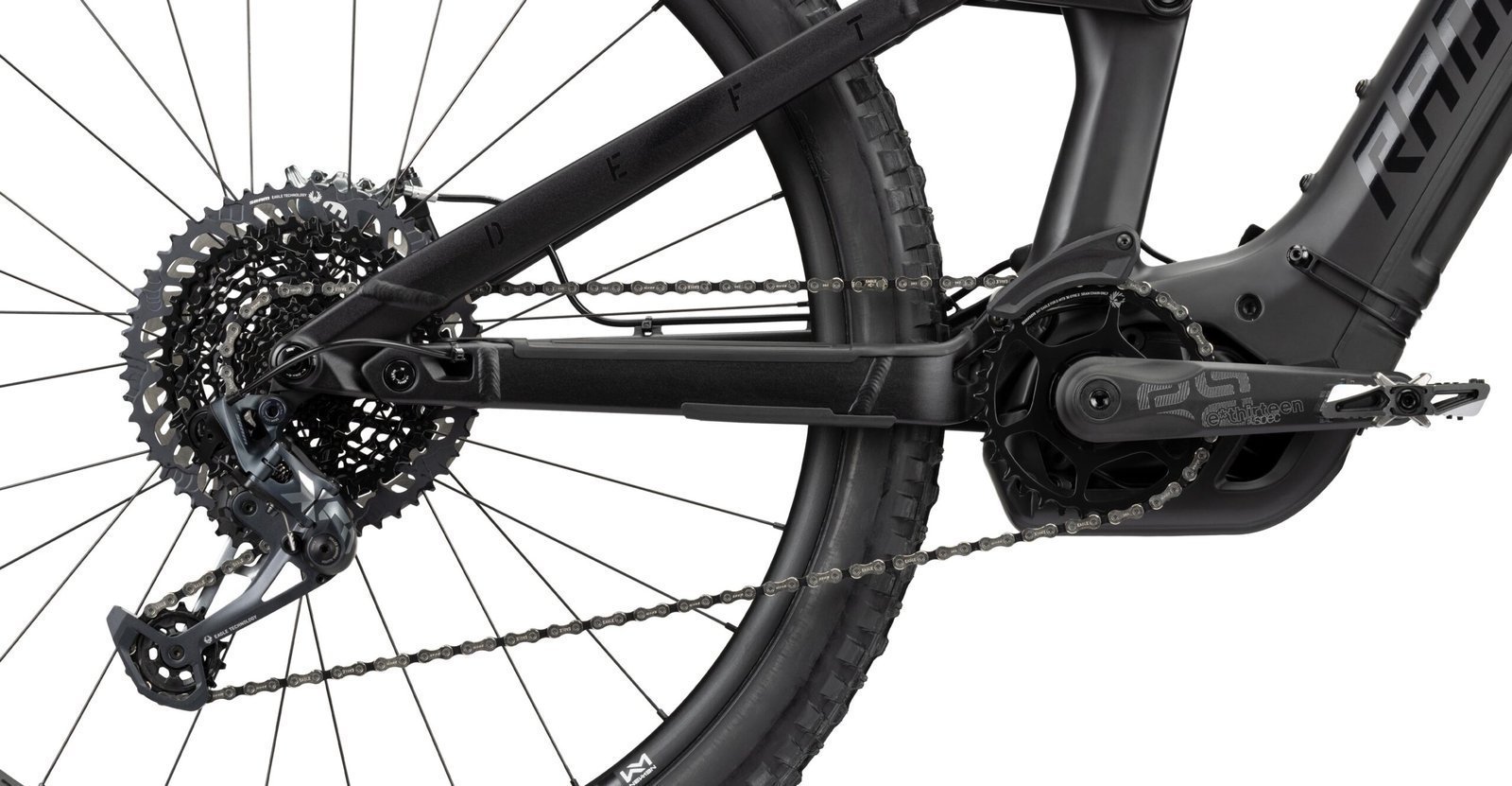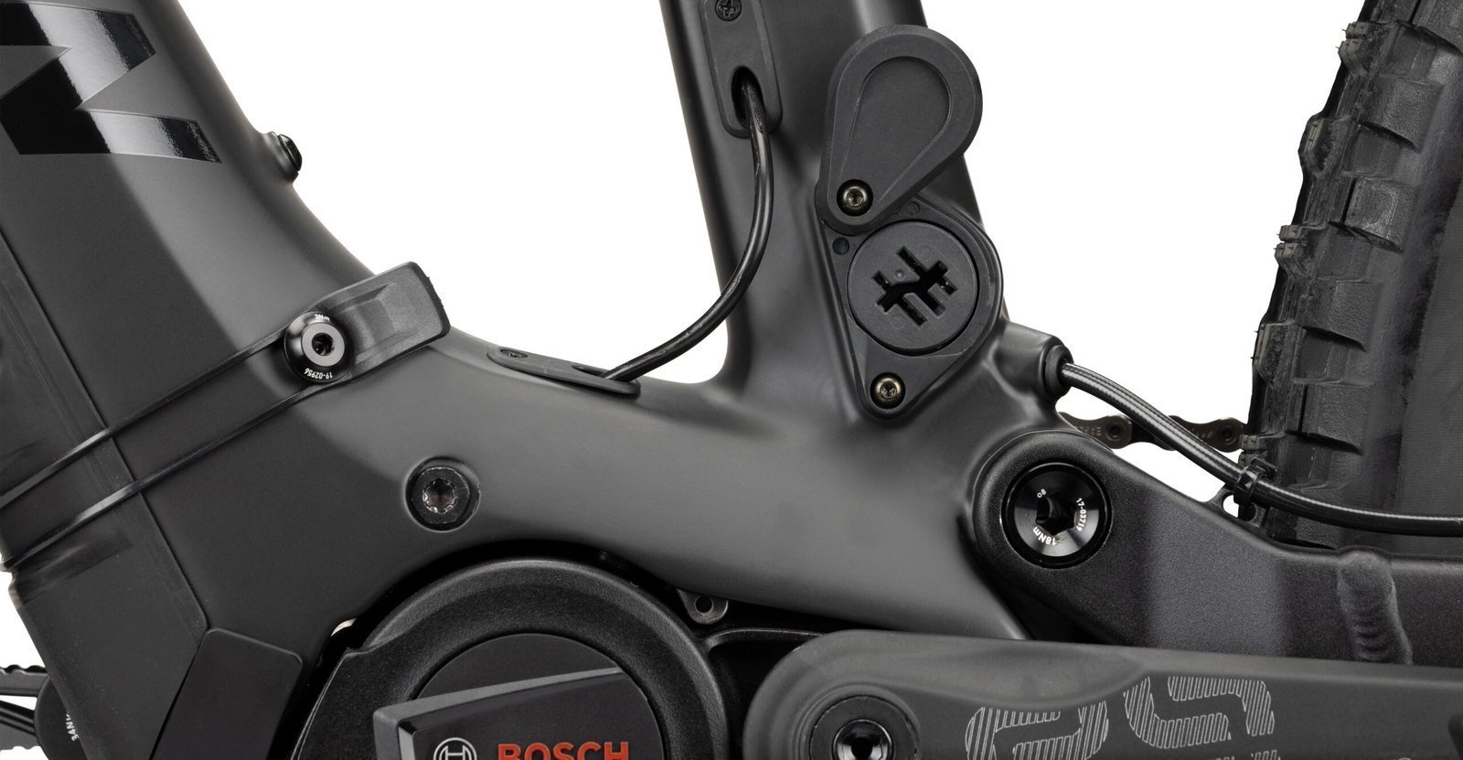 Der flügelähnliche Überwurf, welcher Ober und Unterrohr verbindet, macht nicht nur optisch was her, sondern bietet auch in technischer Hinsicht ein absolutes Highlight. Sowohl der Carbon-Hauptrahmen als auch die Trunnion-Dämpferaufnahme bewirken eine Menge Steifigkeit und Stabilität. Wie auch beim RENDER bietet die untere Dämpferaufnahme gleichzeitig einen Teil der Wippe, welche dem Rahmen eine einzigartige Kinematik und besonders hohe Stabilität des Hinterbaus verleiht. Der 750Wh große Akku wird durch eine Patrone in das Unterrohr integriert, die für geräuscharmes Fahren und einen wackelfreien Sitz sorgt. Durch eine gummierte Abdeckung, welche das Unterrohr abschließt, lässt sich der Akku problemlos und schnell entnehmen. Mittels der am Sitzrohr befindlichen Ladebuchse lässt sich der Akku ohne Entnahme laden. Das Schaltwerk wird am neuen, herstellerübergreifend genormten UDH hanger montiert, der Speedsensor ist elegant in der Bremsscheibe und Kettenstrebe integriert, sodass der klassische Speichenmagnet der Vergangenheit angehört.