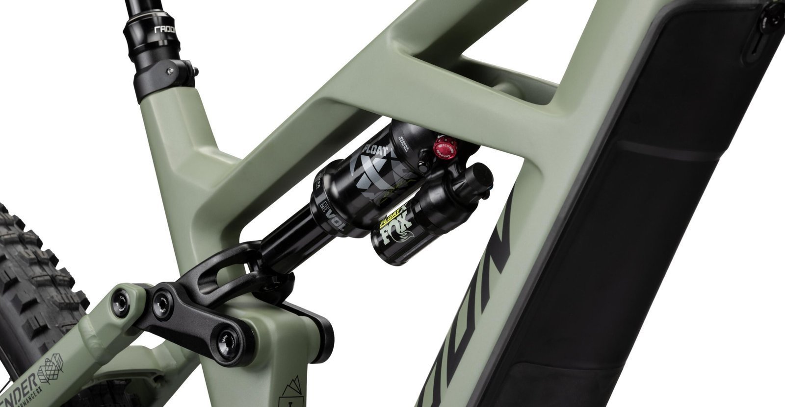 Der RENDER Rahmen ist ebenso ein optischer Leckerbissen wie Herberge für allerlei technische Finessen. So hat der Frontrahmen aus Carbon einen Verbindungssteg zwischen Ober- und Unterrohr, der sowohl als Designelement an einen Flügel erinnert als auch in technischer Hinsicht die Steifigkeit erhöht und gleichzeitig als Aufnahme für den Dämpfer fungiert. Die Dämpferverlängerung auf der anderen Seite fungiert gleichzeitig auch als Teil der Wippe und ermöglicht so einerseits die einzigartige Kinematik und trägt zudem zur sehr hohen Stabilität des Hinterbaus bei. Die 625 Wh große Batterie sitzt integriert im Unterrohr in einer Patrone, die den wackelfreien Sitz gewährleistet und außerdem die intern verlegten Züge seitlich führt und somit für Klapperfreiheit und Ordnung sorgt. Eine abnehmbare Kunststoffklappe schließt das Unterrohr ab und ermöglicht bei Bedarf die Entnahme des Akkus. Für den Ladevorgang ist das jedoch nicht nötig, denn der Rahmen verfügt im Sitzrohr über eine externe Ladebuchse. Integriert in den Steuersatz ist der Block Lock, eine Vorrichtung, die das Einschlagen der Gabel in den Rahmen im Falle eines Sturzes, verhindert. Das RENDER verfügt über 160mm Federweg an der Front und 140mm am Heck und nimmt Reifen bis zu 2.6″ Breite auf.